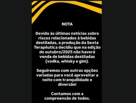 Um evento em Maceió decidiu cancelar a venda de destilados após os riscos com a propagação do metanol. Em nota, divulgada hoje (2), os organizadores da "Sexta Terapêutica", festa que acontecerá no Jaraguá amanhã (3), informou que vai oferecer outras opções de bebidas para quem vai participar do evento.