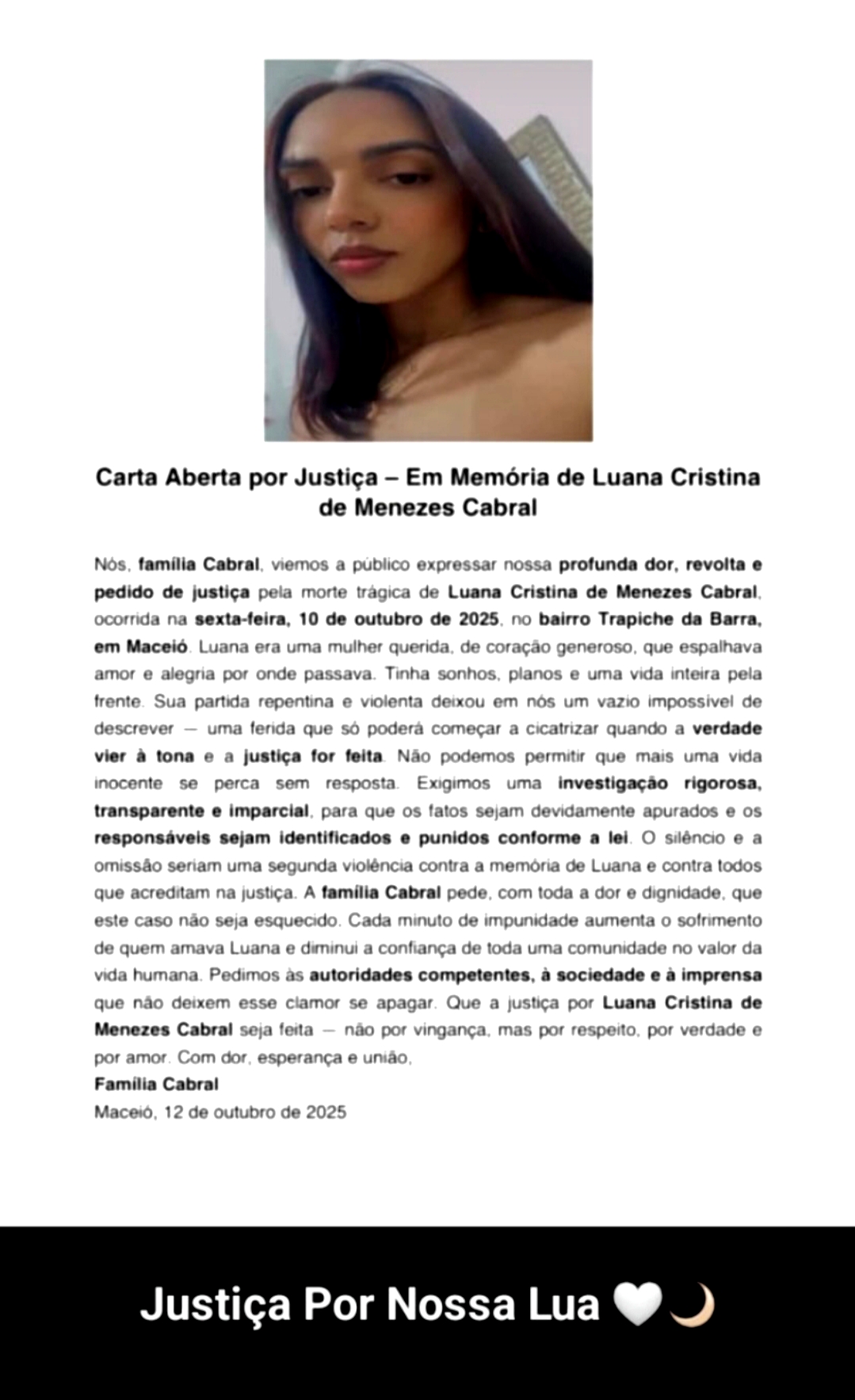 "Não podemos permitir que mais vida inocente se perca sem resposta. Exigimos uma investigação rigorosa, transparente e imparcial para que os responsáveis sejam identificados e punidos conforme a lei", diz um trecho da carta.