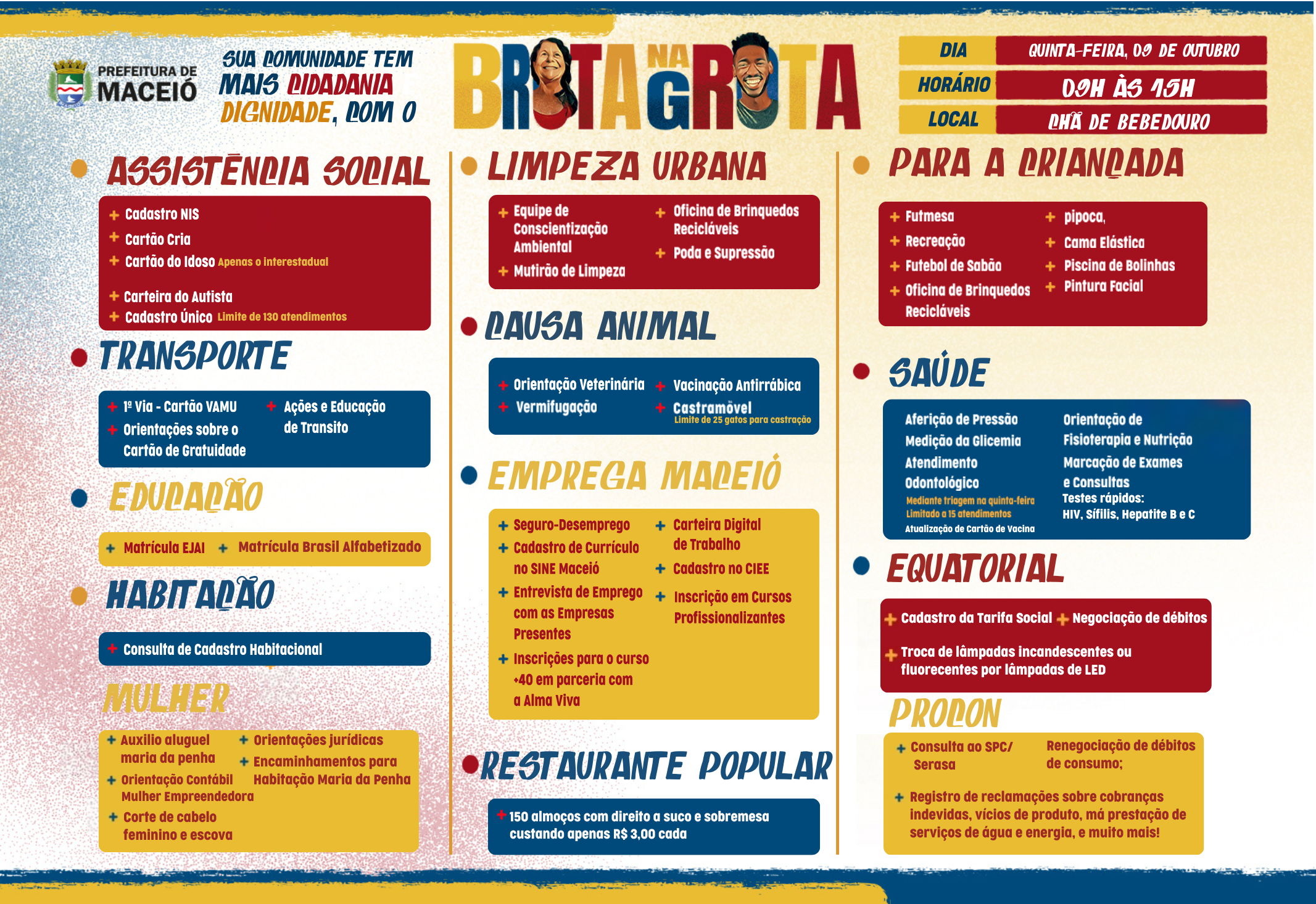 Nesta sexta-feira (17), a Prefeitura de Maceió promove mais uma edição do programa Brota na Grota, desta vez no bairro Chã de Bebedouro, das 9h às 15h. O evento acontece no campo do Chã de Bebedouro por trás da DHPP, reunindo serviços gratuitos que levam cidadania, inclusão social e inovação diretamente para os moradores.