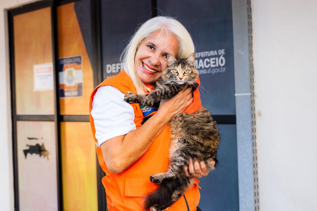 “Agora eles também são agentes da Defesa Civil”, diz Edivane com um sorrisão no rosto. “Amo receber as pessoas aqui para ajudar no que for preciso e amo cuidar dos gatinhos, eles são meus companheiros aqui na recepção”, acrescenta.