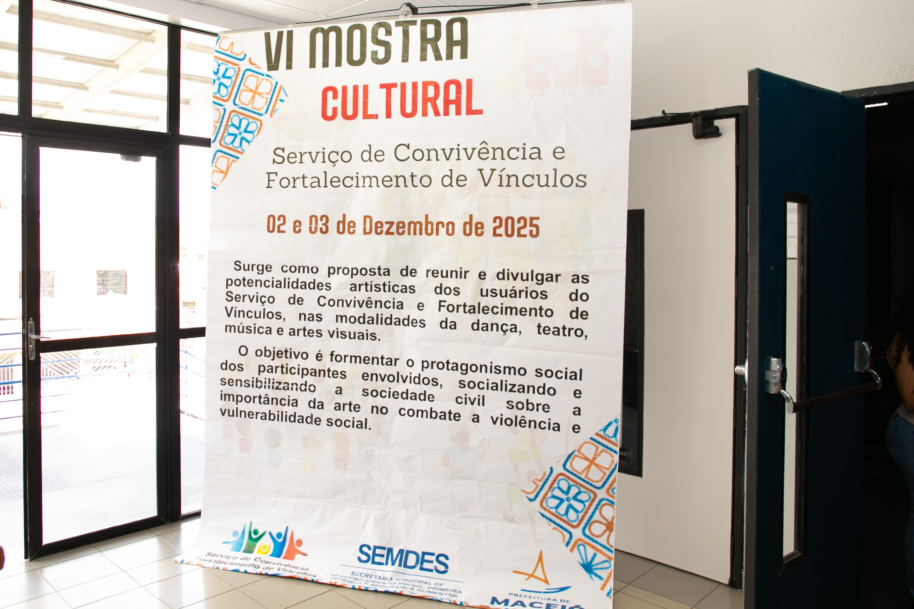 A Secretaria de Desenvolvimento Social, Primeira Infância e Segurança Alimentar de Maceió (Semdes) realizou, nesta terça-feira(2), o primeiro dia da 4ª Mostra Cultural, no auditório do Senai, no bairro Poço. A iniciativa da Coordenação Geral do Serviço de Convivência e Fortalecimento de Vínculos reuniu apresentações dos usuários dos Cras Bebedouro, Bela Vista, Cidade Universitária, Therezinha Normande, Cacilda Sampaio, Sônia Sampaio, Fernão Velho e Área Lagunar.