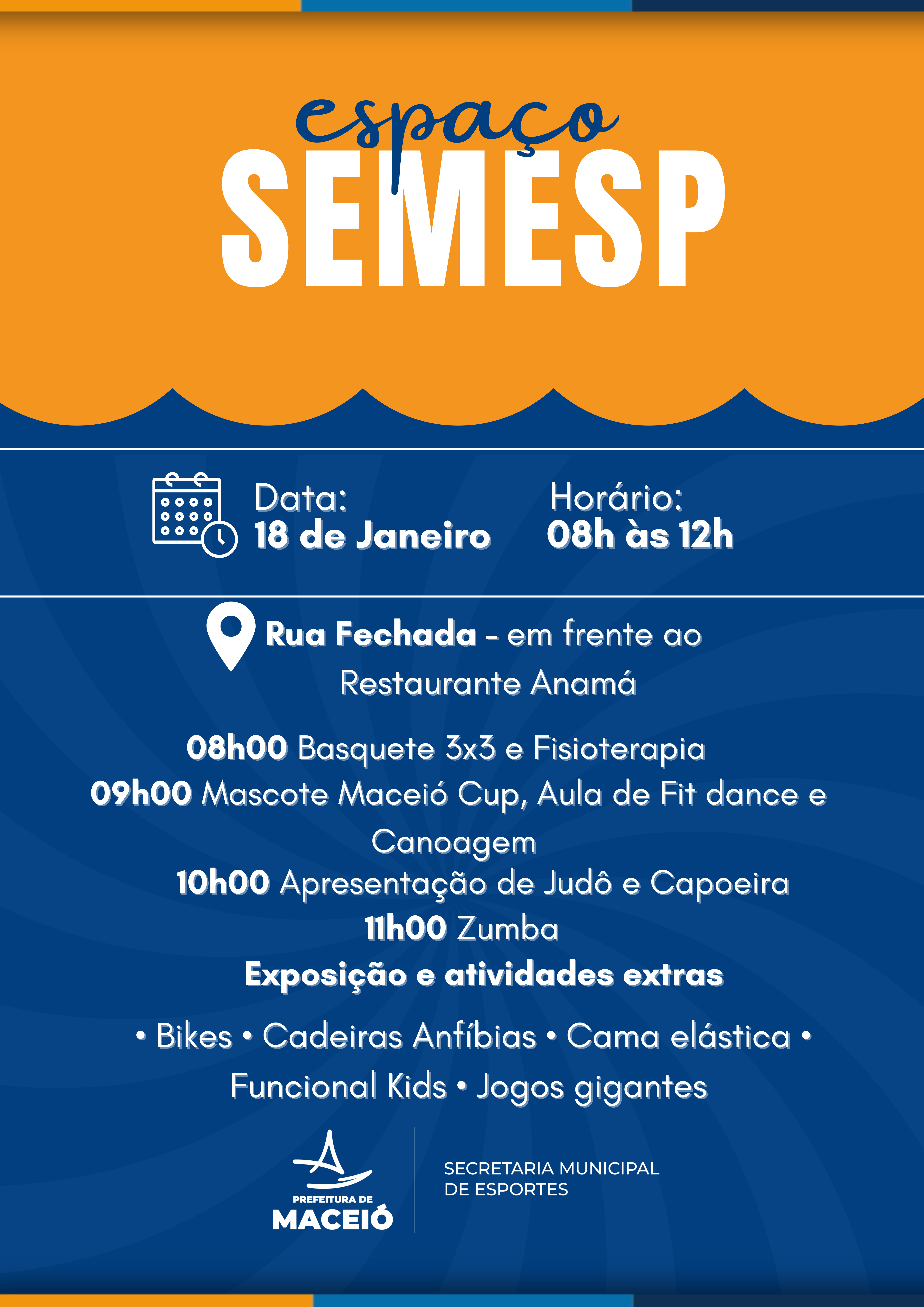A primeira edição do Espaço Semesp 2026 será realizada neste domingo (18), na praia da Ponta Verde, com uma programação diversificada e mais de 10 atrações gratuitas para a população. O evento é promovido pela Secretaria de Esportes de Maceió (Semesp) e acontece das 8h às 12h.