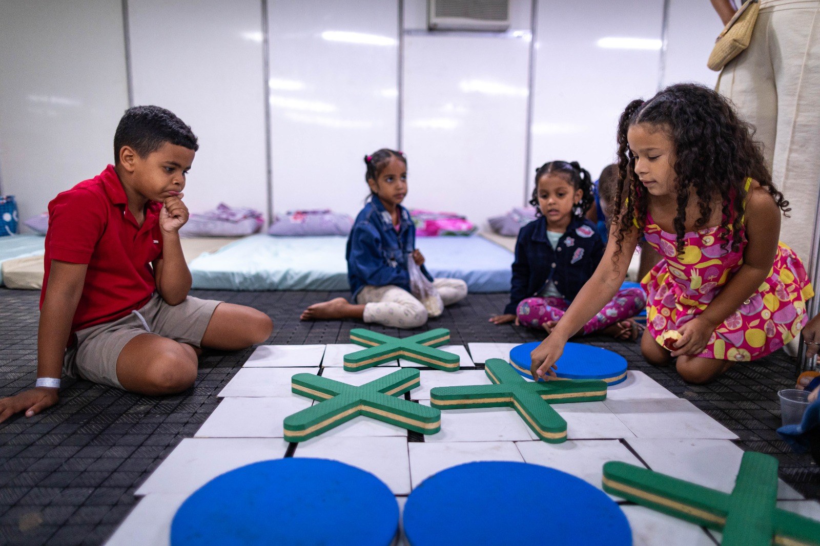 O "Espaço Acolher" está recebendo crianças de até 12 anos de idade a partir das 16h. No local, as crianças podem fazer pinturas, leituras e outras atividades recreativas. Quando der sono, os pequenos podem deitar-se em um dos 30 colchões oferecidos na estrutura. A sala oferece ainda a oportunidade de assistir filmes infantis e realizar um lanche quando sentir fome.