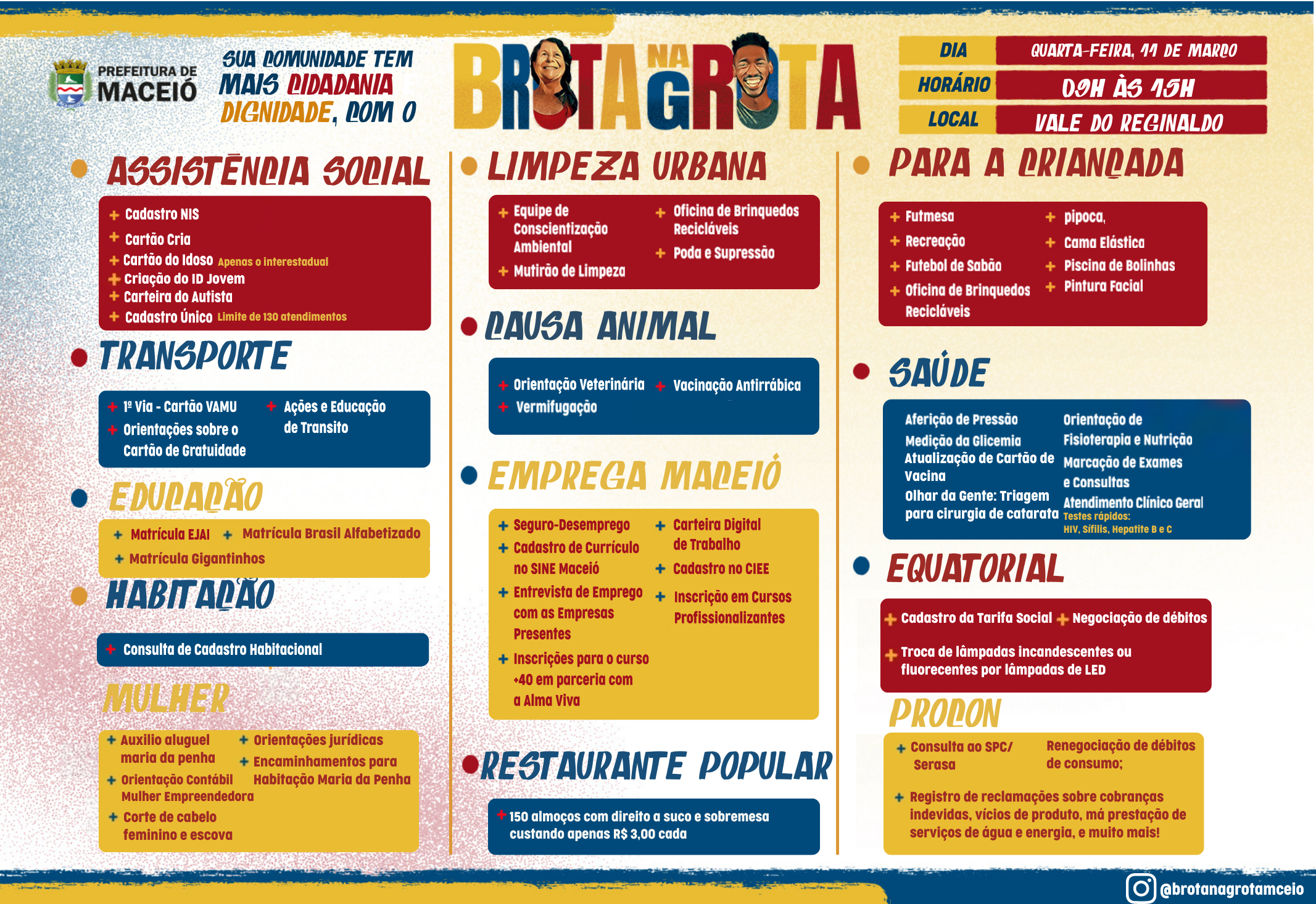 Nesta quarta-feira (11), a Prefeitura de Maceió realiza mais uma edição do programa Brota na Grota, desta vez no Vale do Reginaldo. A ação acontece em frente ao Movimento Dando As Mãos, no Danta, das 9h às 15h, levando diversos serviços gratuitos à população e promovendo cidadania, inclusão social e inovação para os moradores da região.