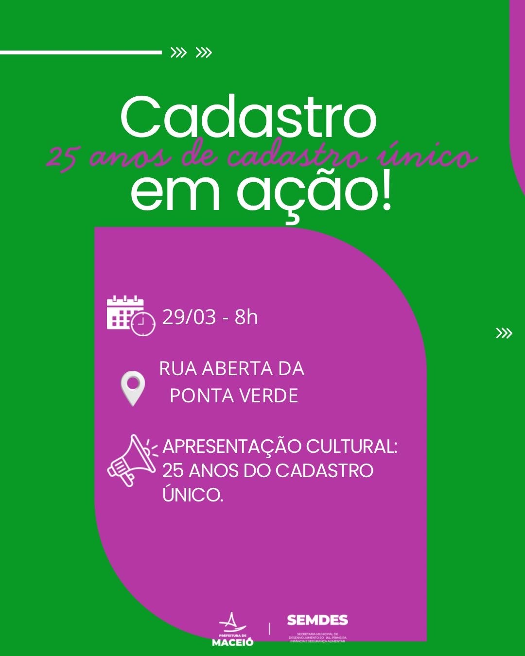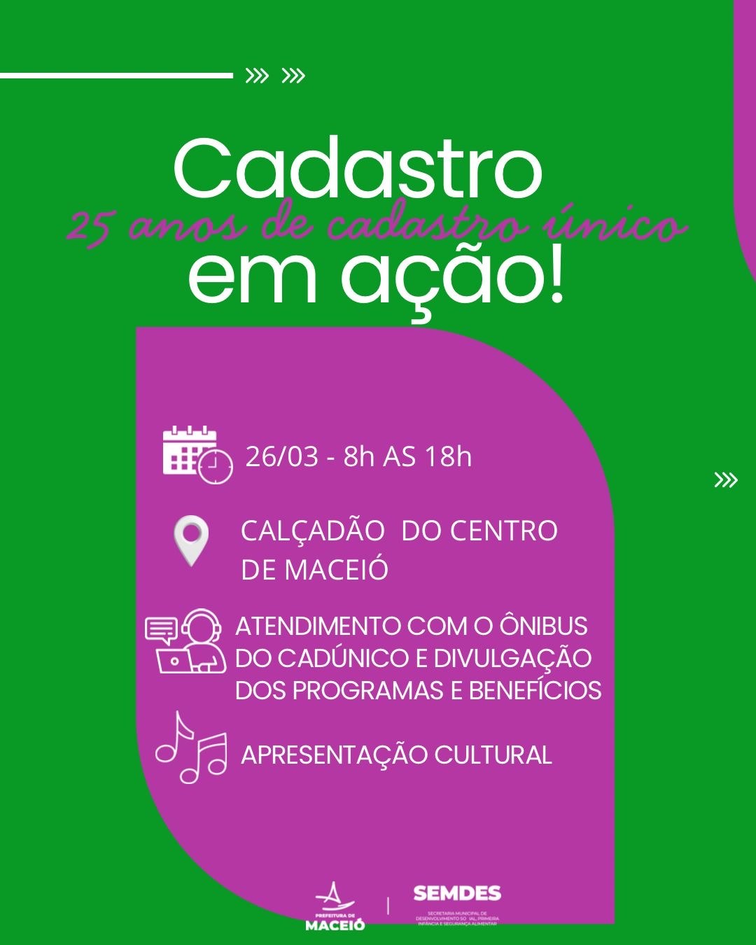 A Secretaria de Desenvolvimento Social, Primeira Infância e Segurança Alimentar de Maceió (Semdes) realizará uma programação especial em comemoração aos 25 anos do Cadastro Único. As atividades começam na próxima quinta-feira (26) e seguem até o domingo (29), com uma série de ações voltadas à população.