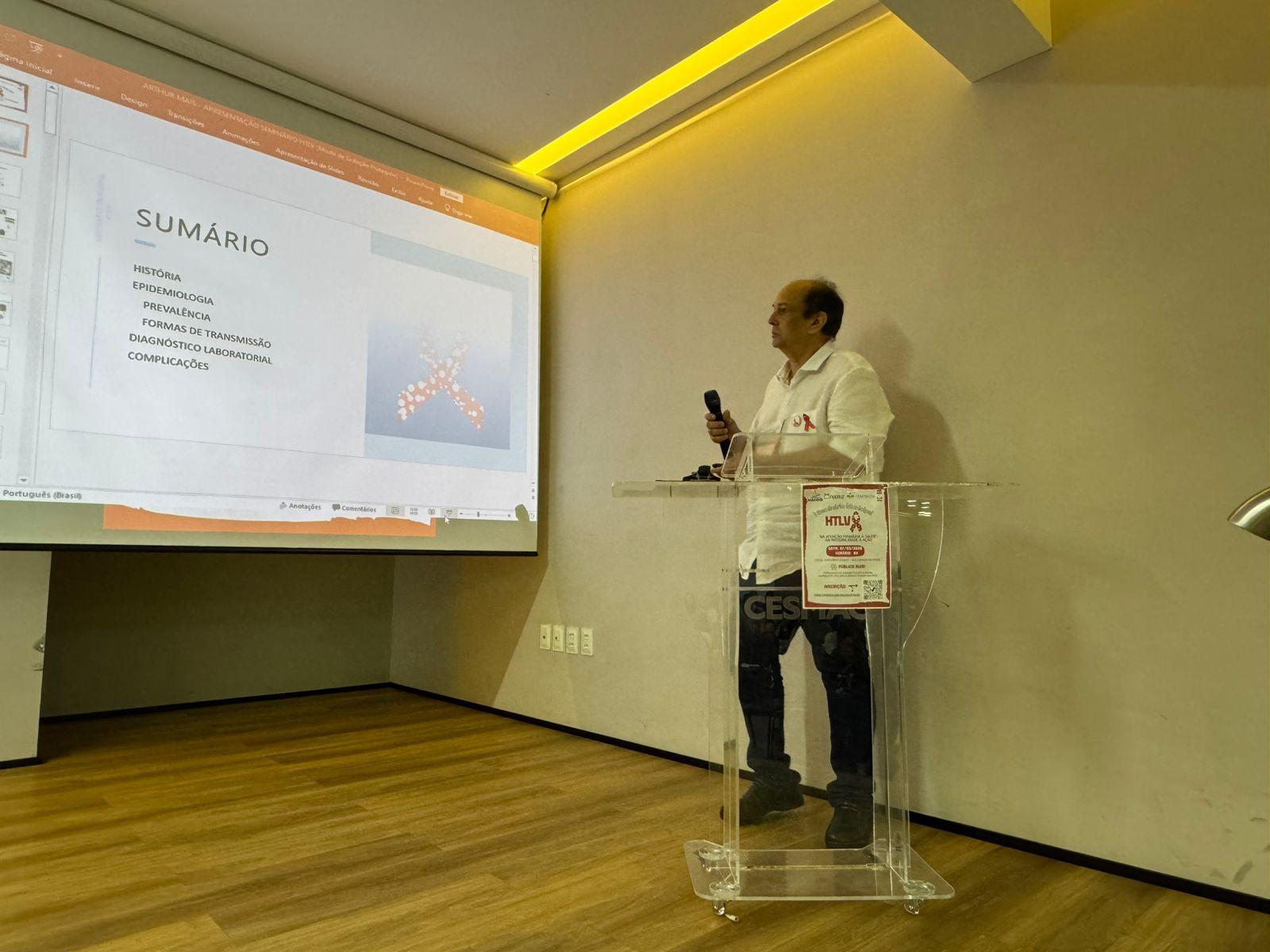 A mestranda Ana Márcia Agra apresentou reflexões sobre conhecimento, prevenção e vigilância do HTLV em Maceió, seguida pelo infectologista dr. Arthur Maia Paiva, que tratou da história, epidemiologia, prevalência, diagnóstico e complicações do vírus.