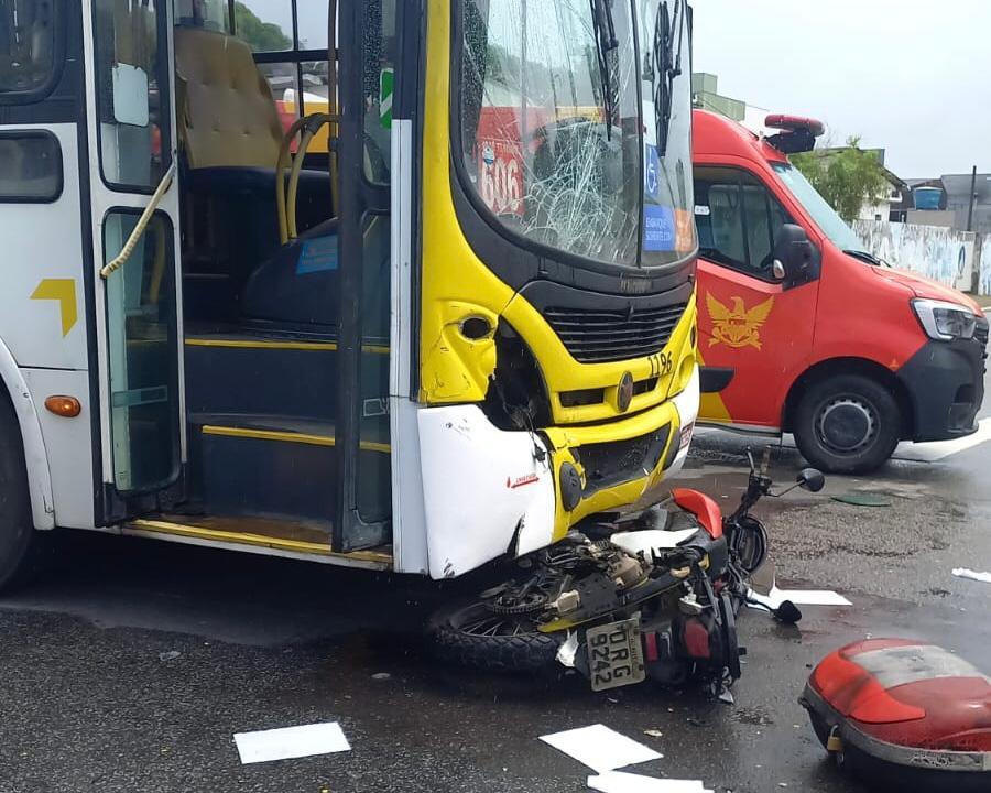 Colisão entre motocicleta e ônibus deixou duas pessoas feridas na manhã desta segunda-feira(13)