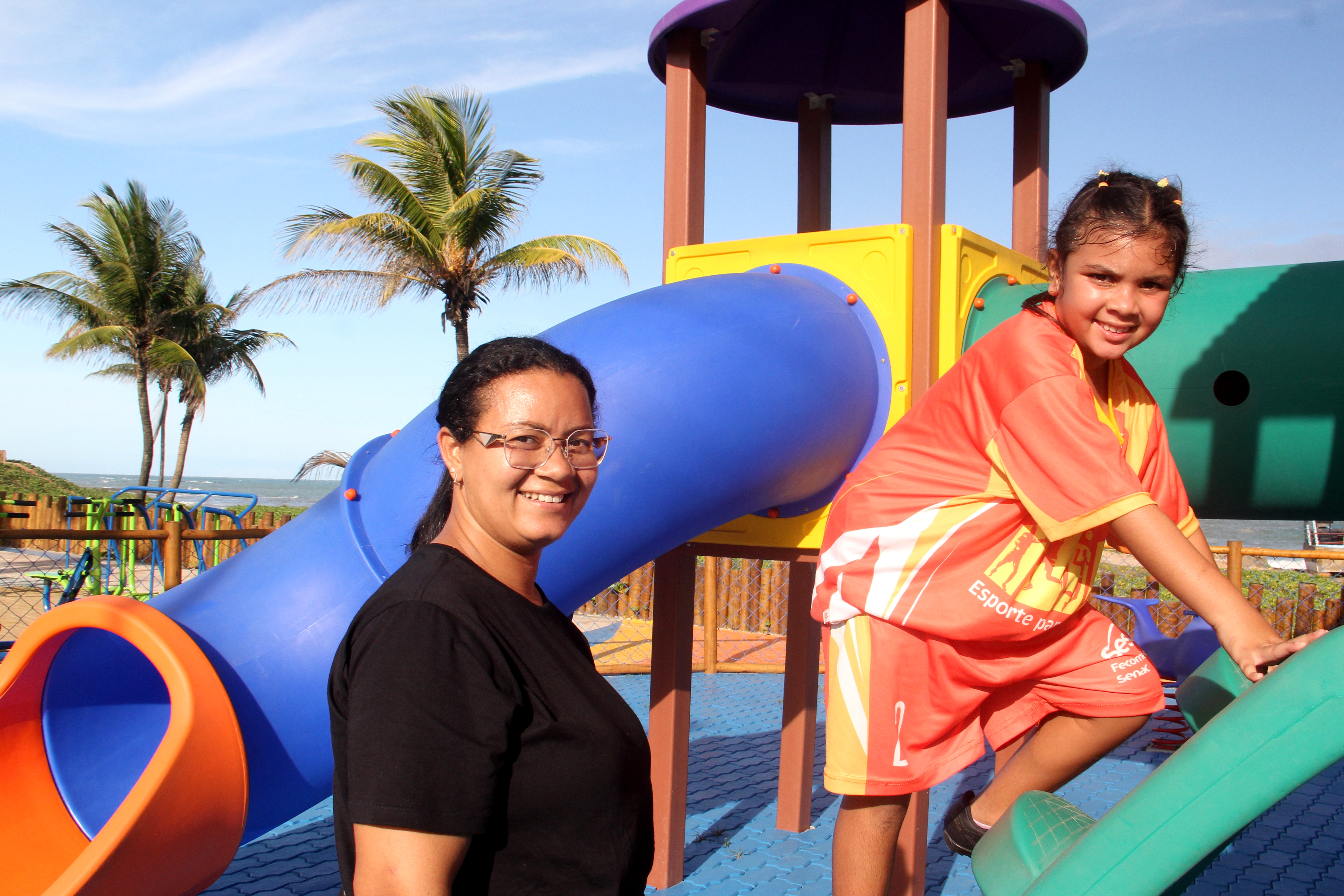 Íris Luna e a filha se divertem no Parque Linear de Riacho Doce. Foto: Neno Canuto/ Secom Maceió