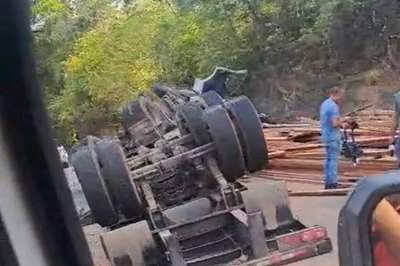 Maceió 18/11/2025 as 06h55Motorista perde o controle da direção e tomba carreta com madeira, na AL-105 -