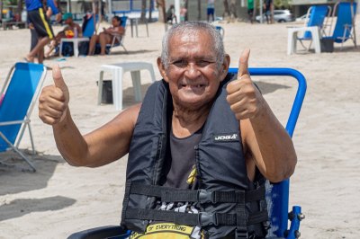 Cadeira anfíbia auxilia pessoa idosa a tomar banho de mar assistido